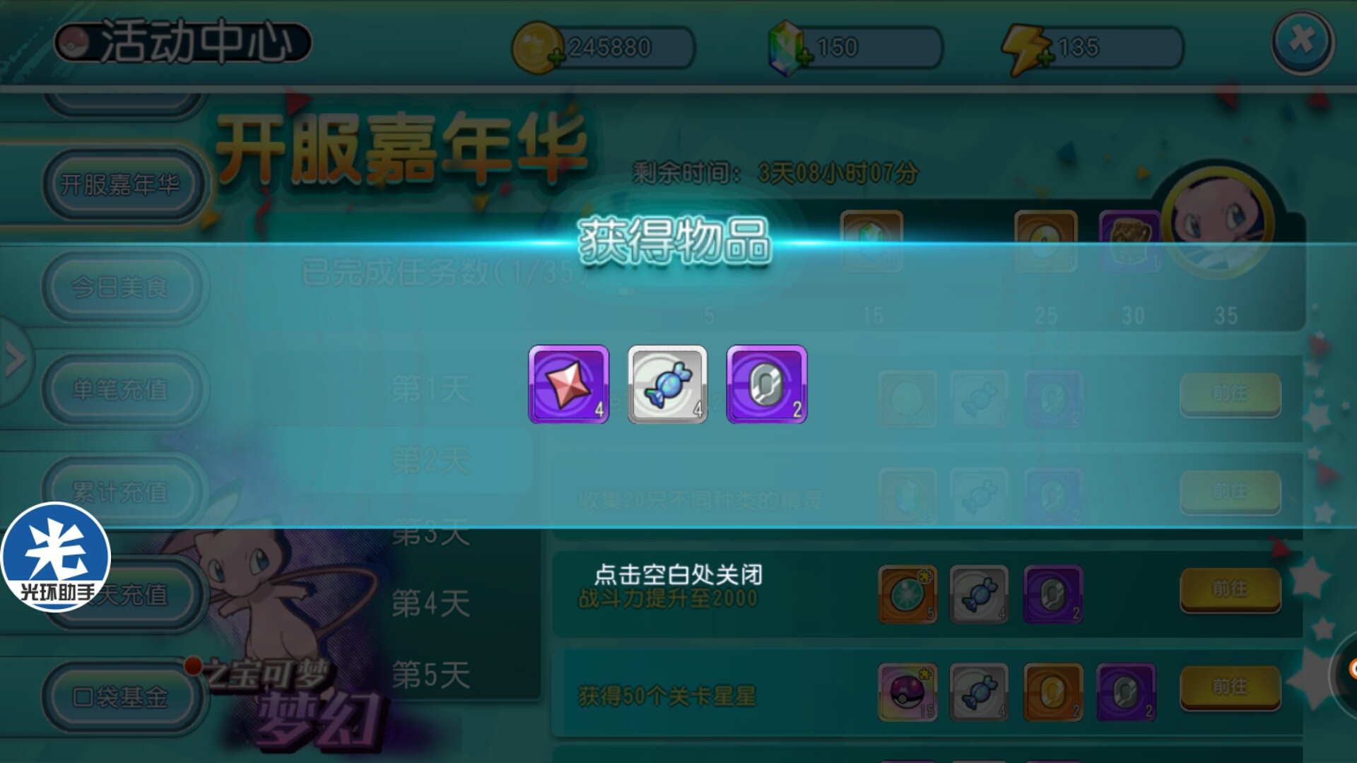 开服嘉年华:完成第一天到第四天的每一个任务就可以获得5个小神奇糖果。