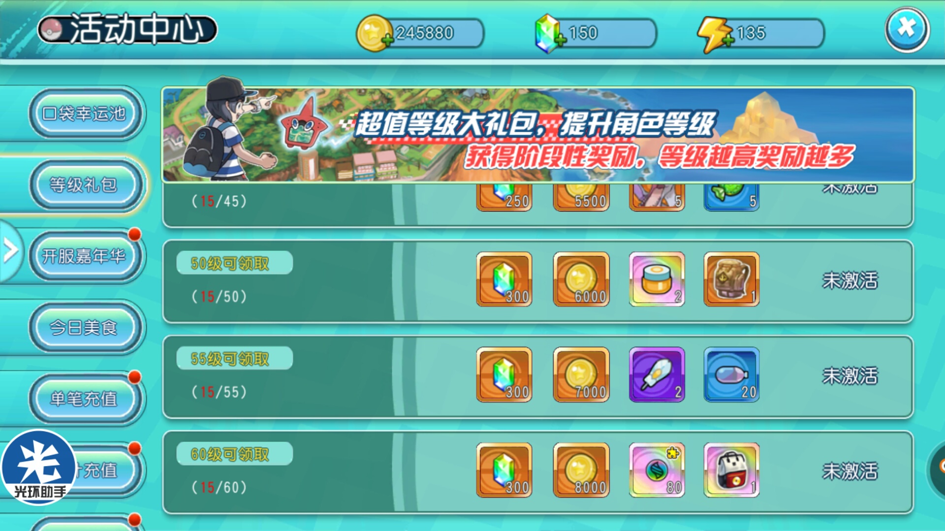 等级礼包:当玩家等级达到10级、25级即可获得小的神奇糖果,等级达到30级、35级、40级、45级中等神奇糖果。