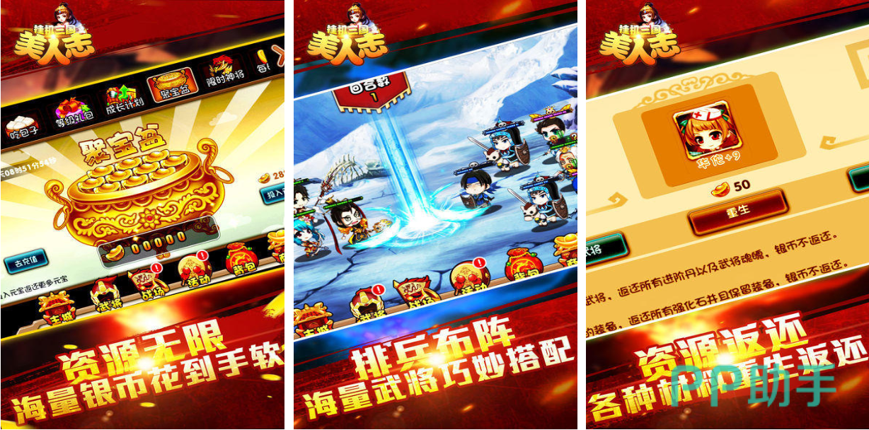 挂机三国美人志是专门准对挂机游戏爱好者开发的三国卡牌游戏,画面风格Q萌精致带来了不错的视觉体验,轻松自在的挂机玩法也为这款卡牌游戏润色不少,剧情方面独立于三国演义给人带来了另类的游戏体验,萌点十足的界面UI更让本作观赏性大大提升,人物建模十分精美令不少三国游戏迷大开眼界。
