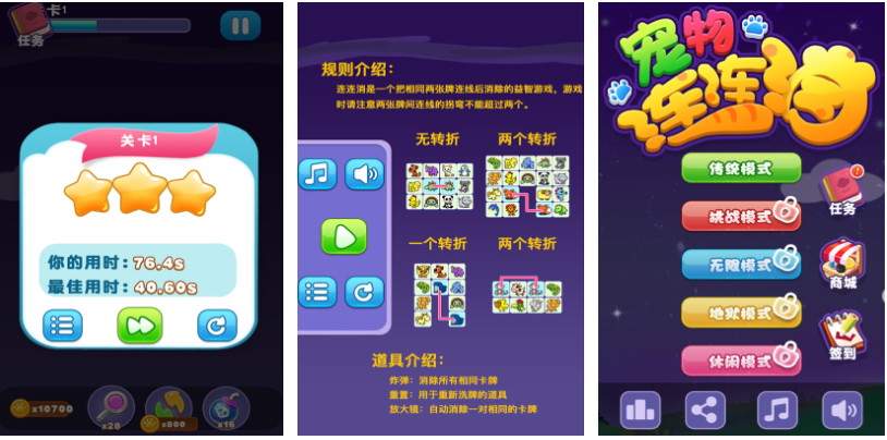 在这款连连看游戏中玩家可通过连线的方式消除可爱的宠物,画面风格卡通可爱跟宠物的主题相得益彰,五大连线消除模式的加持令连连看游戏粉丝久玩不腻,刻画可爱的各种小动物坐等玩家们依次消除,丰富的消除任务和成就奖励增加了游戏耐玩性,各位连连看手游爱好者试试这款宠物主题的消除游戏吧。