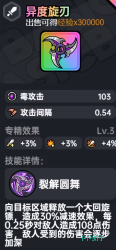 想要单刷冥界之王的新手玩家,也可以选择使用异度旋刃,这把武器是毒属性的攻击,附带有裂解圆舞技能:可以向boss释放一个大回旋镖,造成30%的减速效果,而且每0.25秒108点dps,玩家拖延时间越长,中毒伤害逐步加深。在单人对付冥界之王二阶段的时候会很好用,其余武器格子推荐三生雷影、死亡之吻或者浮游。