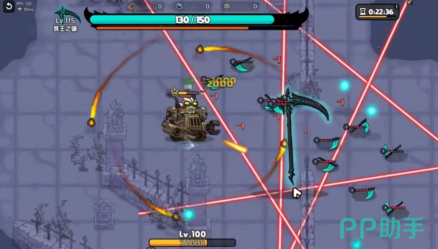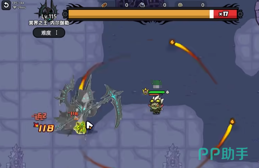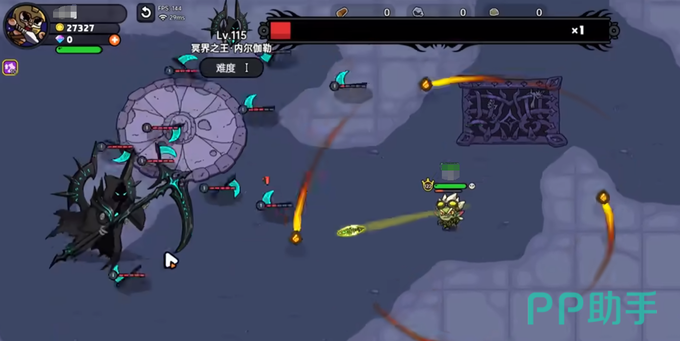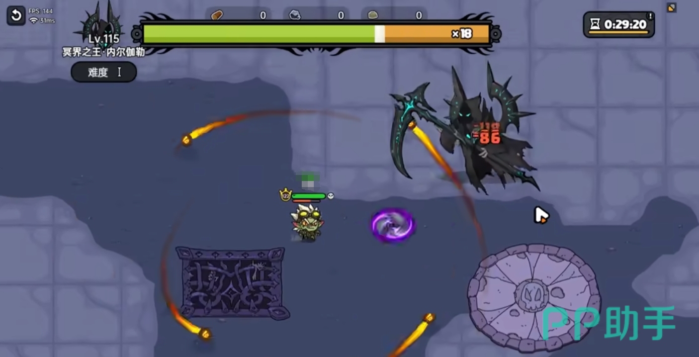 进入冥界之王挑战boss房间,右上角有挑战倒计时,与boss见面会开小镰刀一技能,玩家需要用远程武器,提前把小镰刀清理掉。接着用蜉蝣刮一下在屏幕边缘的漏网之鱼,屏幕上面的小镰刀清理完毕后,boss会进入虚空闪现接近,此时必然要拉开与boss的身位,玩家一边游走一边攻击,难度不高。
