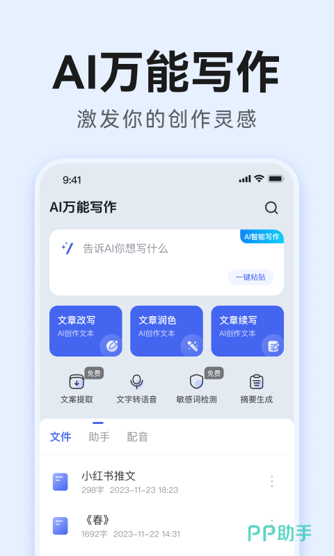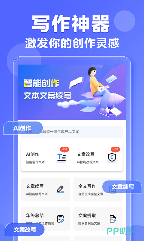 有一些朋友虽然会写文章,但是不会写所有类型的文章。用了这款软件之后,即可通过AI帮助你生成对应类型的文案或者模板,通过这些能力。你就可以借助AI一键制作对应的文案,并且有多种主题助理可选。