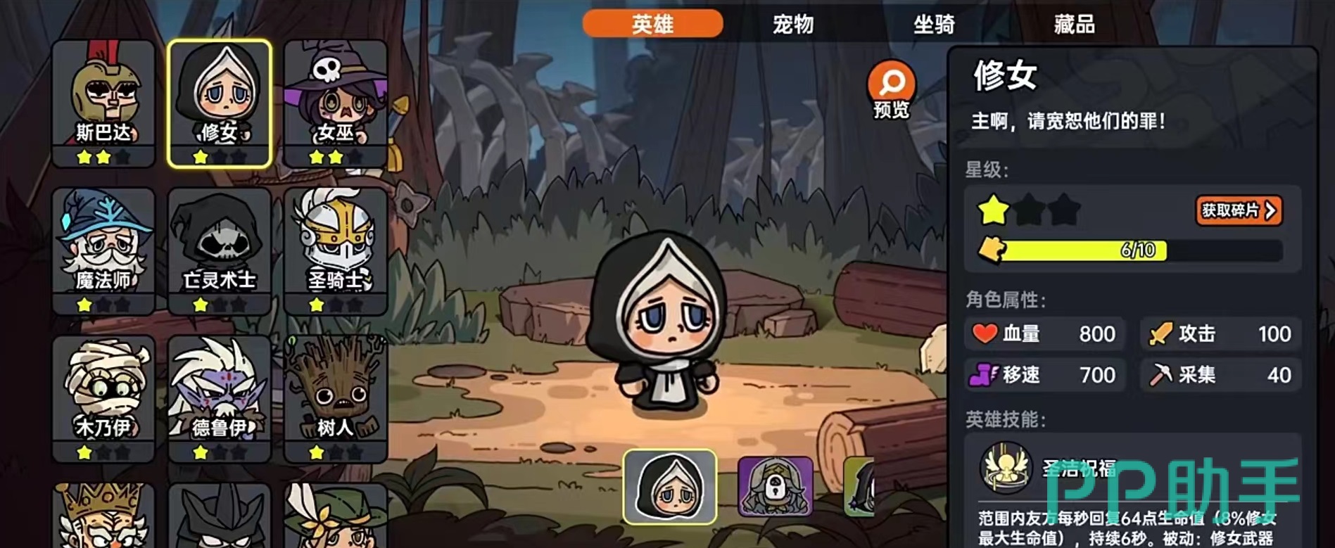 首先是在新手角色选择方面,小编比较推荐修女、炸弹人、树人和圣骑士等这些角色。普遍具有无敌回血等技能,容错率比较高。例如修女技能圣洁祝福,可以为范围内的队友恢复血量,且持续进行恢复,还有被动效果,使装备带来的治疗加成,血量多了自然容错也就高。选好角色之后就是接下来的开局升级,有两种路线可以选择,第1条是比较适合懒人的路线,就是尽量躲避一切怪物,先砍树,挖石头和粘土等资源,解锁农田,然后直接按照种田挂机的形式去升级,毕竟游戏里的玩法很多,并不一定非要去打怪和与其他人战斗。等级高了会解锁高级农田,建议在主城附近进行,这样可以防止受到骚扰。