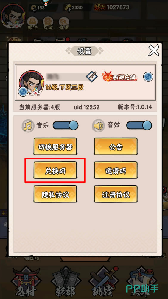在这个设置界面中,可以对游戏进行音乐、音效的打开和关闭,以及其他功能按钮,其中就有兑换码。
