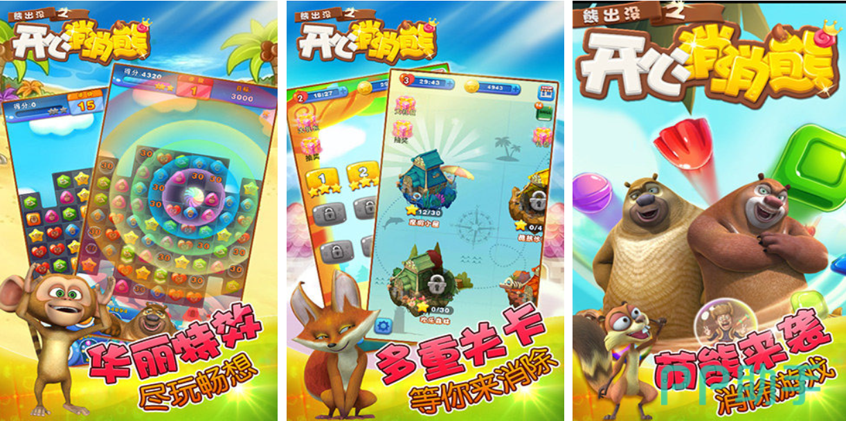 这款漫改的卡通向消消乐游戏具有超多的关卡与花哨的特效,熊出没动画里各种萌哒哒的动物也会在关卡中出现,卡通的视觉效果与氛围渲染提高了整体的观赏性,小动物们提供的各种辅助道具让过关速度更加快速,方便快捷的操作机制也是消消乐系列手游的标配,各位熊出没动画粉丝快进入游戏完成一系列三消任务吧。