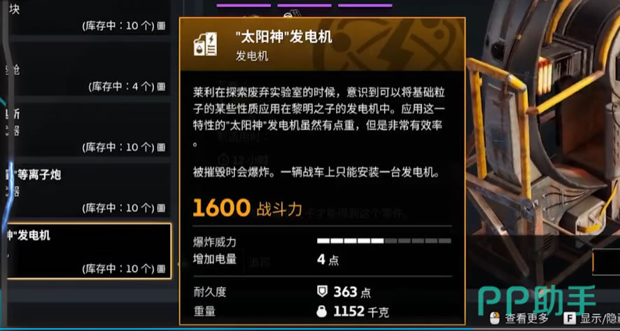 由于大量能量武器的存在,所以黎明之子对于发电机的研发优先级很高。这不是带来了游戏中最强悍的“太阳能”发电机,4点的能量提供,被摧毁还能造成爆炸效果,唯一的缺陷可能就是太重了,不但考验底盘,并且一定程度上挤压了安装其他配件的承重空间。