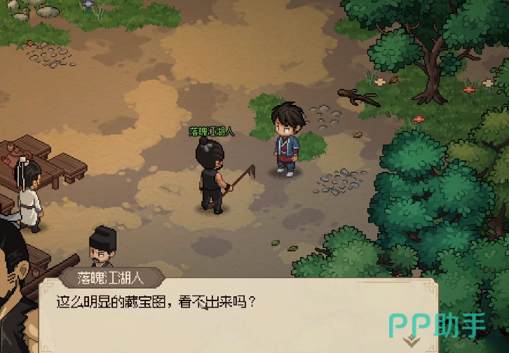 在无名茶滩这个地区玩家会遇到落魄江湖人帮助他杀掉差役之后就能获得三个藏宝图,首先通过第一个藏宝图,玩家可以看到宝藏的位置在楚襄城的心湖,想获得这个宝藏的话就需要等到夜晚来到地点挖宝,在这个位置会有十辆银子,还有玉白钥匙以及琼花露和十贯钱。