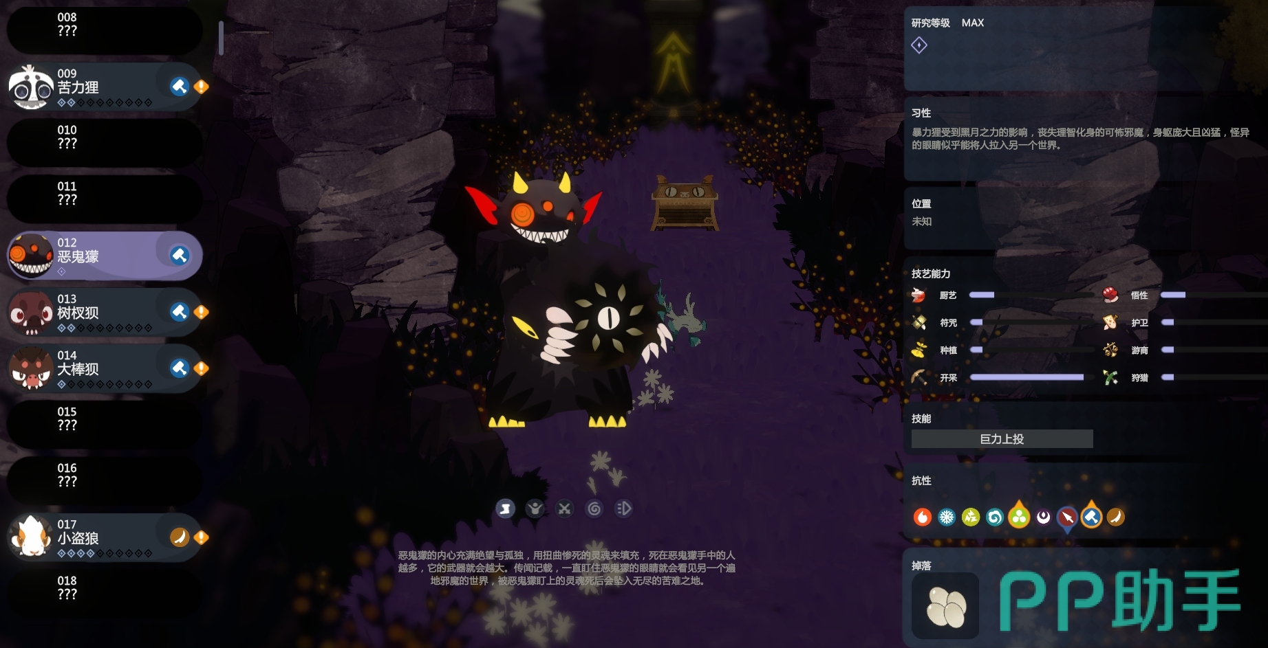 游戏中目前最强的怪应该是恶鬼獴。他是一只10级邪魔,也是玩家目前能遇到的最高等级的邪魔。这个邪魔是由妖精暴力狸邪魔化产生,技能有点类似,并且邪魔血量极厚,远不是一般的妖精可以比。这个怪的技能名为巨力上投,是个多段伤害技能。释放以后,会对玩家妖精进行巨石攻击,附带爆炸伤害。爆炸后的巨石会变成若干小石头。这些小石头会继续爆炸,对玩家妖精持续造成伤害,整体伤害极高。