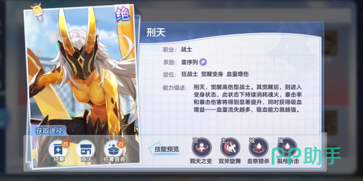 刑天,雷系毕业C,血越少伤害越高,觉醒后提升明显,攻击加双暴提升,有吸血,且技能附带对方最大血量伤害,克制坦克,360°无死角战士。