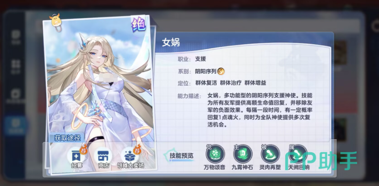 女娲,独一档的支援角色,有复活有治疗有增益,给所有队友加属性,全体治疗和净化,独特的复活机制能保队友2次,什么阵容都可以搭配,有了它难度大大降低。