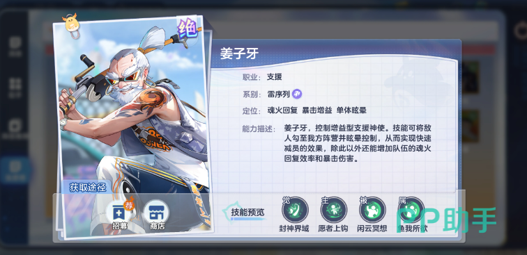 姜子牙,雷队的毕业辅,对策卡,控制能力很强,群体眩晕加易伤,主动技可以将敌人拉过来眩晕实现速杀。不仅如此,他也能给全体加暴击提升魂火回复速度。