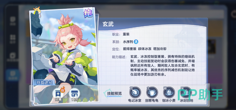 玄武,有冰冻能力,是最契合冰冻队的前排,冰冻敌人越多自身防御越高,本身有高额免伤和嘲讽,并且可以降低敌人的冷却回复,可以很好地控制住敌人并减缓对方释放技能的速度。