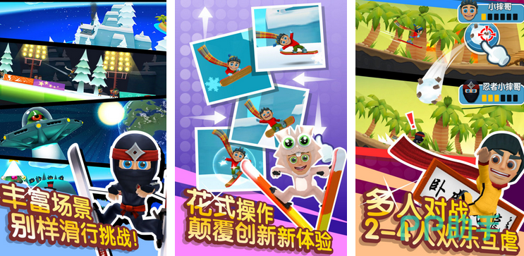 滑行挑战地图较为丰富,不仅有经典的雪地场景,玩家还可以前往太空飞船等多种地图探索。滑雪操作较为丰富,玩家不仅可以改变滑行方向,而且可以做出大笑等多种动作。在多人对战模式中,玩家与两到三位好友一起在主题的滑雪场进行PK,更有各种赛场救援车给玩家带来便利。