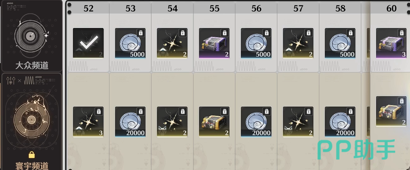 接下来是大月卡,这个便是玩家们所说的寰宇频道,这个是通过各类的任务来提升电台的等级。大月卡分为两种,第一种是寰宇奖励,玩家们可以获取到寰宇频道和大众频道两个频道的奖励。