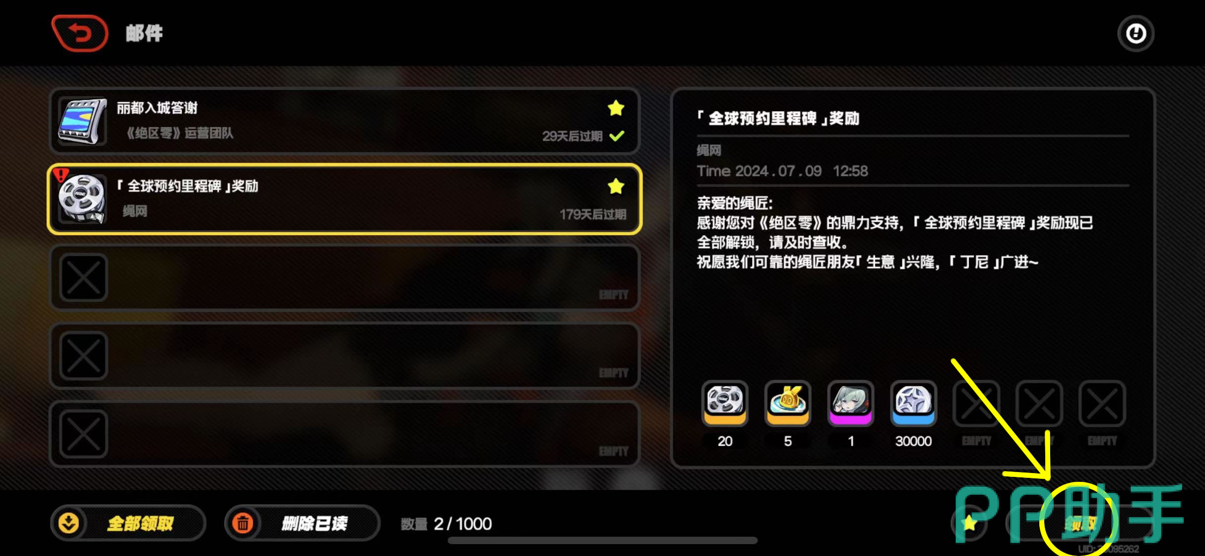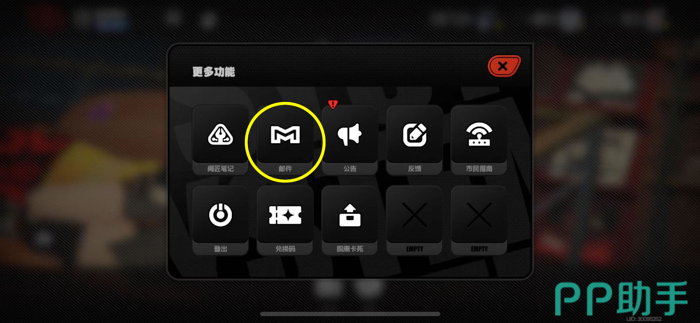 进入界面后,大家可以选择第二个按钮“邮件”进行点击。另外如果邮件中存在未查看,或者虽然查看但未领取邮件中的资源、道具时,这个按钮上方都会有红色标记显示。