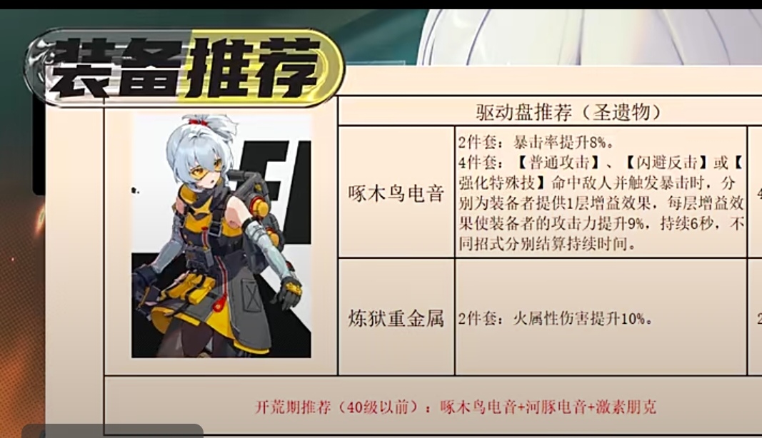 玩家在游戏开荒时间也就是40级以前建议装备可以选择啄木鸟电音+河豚电音+激素电音,等角色等级到了40级以后可以选择啄木鸟电音4件套加上河豚电音两件套。