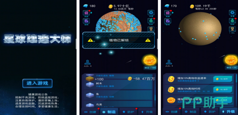 在星球建造方面,除了基本的水,大地和泥土之外,玩家可额外建造鱼和鸟类等各种动物,并且解锁树木等多种植物,玩家从零开始,打造完整的生态系统。建造完成后,玩家需要通过防护和升级的保持星球的稳定。在其他功能方面,玩家不仅可以增加100%的点击能量,而且有机会增加一定比例的离线时间和离线收益速率。