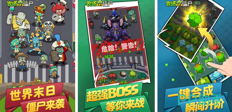 在充满搞怪的卡通画风中,农场中的植物在白天与黑夜两种模式与僵尸展开战斗,喇叭花和菊花苞当多样植物自由挑选。塔防玩法较为有趣,玩家将两个相同的植物进行合成级就可以升级等级,重复操作后形成较强的植物防御墙。在其他模式中,玩家可与有着坐骑的超强僵尸boss展开战斗。