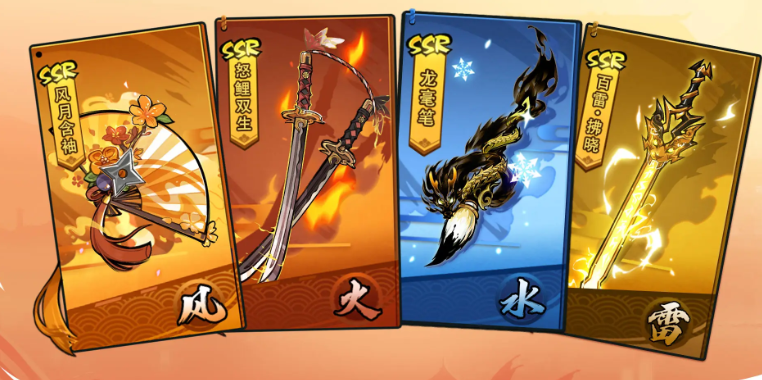 之后大家会看到一个ssr武器免费四选一的活动,这个活动中会给到风火水雷四种属性的ssr武器,大家可以在其中任选一把来使用,这个选择主要看大家有什么角色,或者是能用30连抽到什么角色。