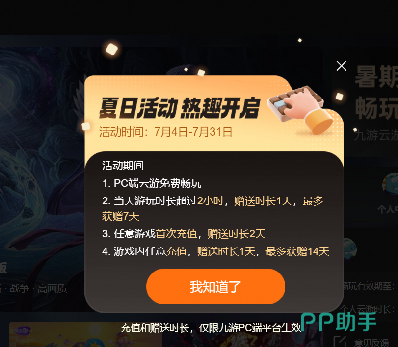 在活动期间,PC端的云游戏都是免费畅玩的,而且游玩时间超过2小时,还会赠送一天畅玩时长,累积可获得七天;首充也有赠送2天时长的福利,本次活动福利多多,不容错过。
