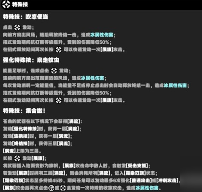 一般苍角的核心技能加点之后,特殊技能也可以适当的加点,毕竟苍角在战斗的过程中也会适当的使用特殊技能,而苍角的特殊技能在战斗中,可能会造成大量的伤害,并且能够产生其他的效果。其实苍角的特殊技能主要是造成冰属性的伤害,另外苍角要是使用特殊技能的话,能够有效的提高生存能力。