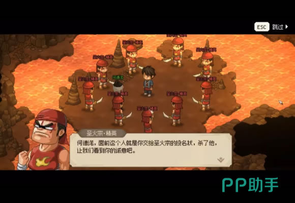 这时出发了圣火宗弟子剧情,原来是何德诺带来的敌人。何德诺本意是想诱出青龙使赖清扬,以便与主角一起联手解决掉他,可惜事与愿违,赖清扬在火蟾洞实力无法发挥没有前来,只有十来个小喽啰前来。顺利解决掉这些圣火宗弟子,对话完毕后何德诺便先行离开。如果之前没有与何德诺的子时聊天对话,何德诺此时是作为坏人登场的,之后也无法收入队伍。