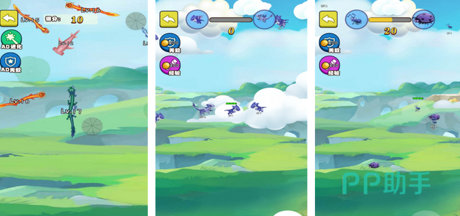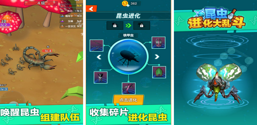 昆虫玩法多多,玩家不仅可以通过按钮唤醒昆虫,并且直接进行升级后组建昆虫队伍,更可以收集铁甲虫等类似的昆虫碎片,在进化系统中完成昆虫的各个部位的进化。昆虫战斗场景丰富。除了大乱斗模式外,玩家还可以参与丛林探险,并且有幸运转盘帮助玩家及时获得道具。
