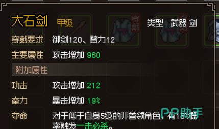 而且大石剑可能还有一些特殊效果,比如说对付那些比玩家等级低的敌人,玩家有机会一击必杀。这种特殊效果,在关键时刻能给玩家带来不小的惊喜。对于新手玩家或者想快速通关的玩家来说,大石剑就像是一个得力的小助手。在游戏前期很多玩家解决不了的问题,都能够通过这把武器来帮助各位更好的成长。