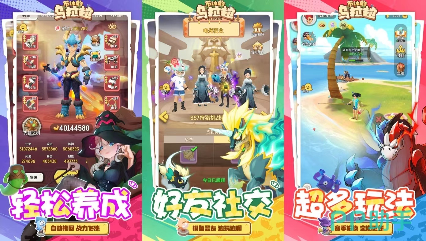 《不休的乌拉拉》游戏里面的放置玩法是非常丰富的,游戏的场景是比较清新可爱的卡通风格,场景可以进行自由的旋转,角色一共分为八种不同的职业设定,每一个职业在作战的时候都有不同的击打方式,游戏里面的动物角色都能成为玩家的坐骑。在组队PK模式里面玩家的战利品可以和好友共同分享,角色也都有很多不同的服装,在放置玩法里面也有很丰富的奖励。