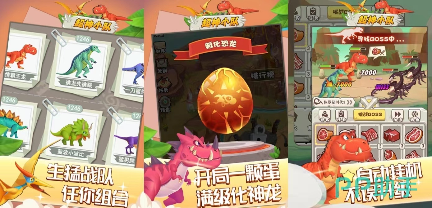 《超神小队》在游戏中玩家会获得不同品种的恐龙蛋,玩家可以从最初的孵化恐龙开始,可以组成不同的碎片然后来获得角色,获得的恐龙角色可以通过强化来提升能力,中国繁殖也可以获得新的恐龙。把恐龙角色组建成一个超神小队,在作战的时候可以切换到不同的场景里面,游戏里面的色彩是很丰富,恐龙角色都是一些卡通的形象。