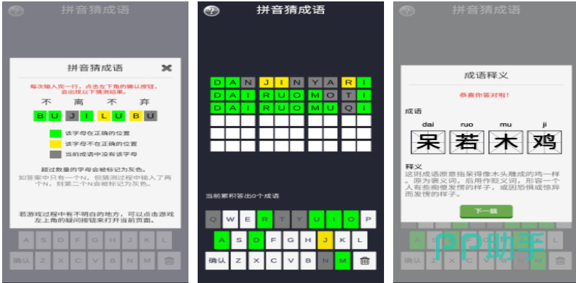 这是款带有真实二十六字键盘的猜词解谜类游戏,运行方式很流畅而且支持纯单机体验,玩家只需根据汉字和图片的提示打出相应的英文字母即可,游戏关卡并没有倒计时的限定所以显得时间充裕,经过这款猜词游戏的洗礼你也会了解更多新的知识,众多跟汉语拼音和词语相关的猜谜关卡深入人心,你的智商和洞察力也会在本作的洗礼下得到锻炼。
