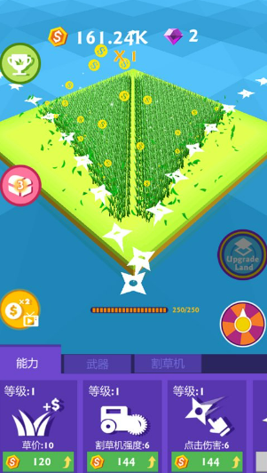在这款游戏中你需要挥舞着你的手指点击屏幕即可,玩家需要将面前的草坪上的杂草全部清理干净,最开始你的工具将会非常简单,你需要不断地闯过关卡获取金币才有机会可以换取新的装备,每一次的装备都需要你升级自己的等级才可以解锁,在游戏中还加入了大转盘的环节,让你在这里也可以享受抽奖的乐趣,当你发觉自己无法顺利在有效时间内完成任务时你还可以看广告来获取道具,在排行榜中你还可以看到其他玩家的积分。