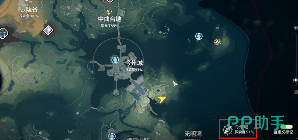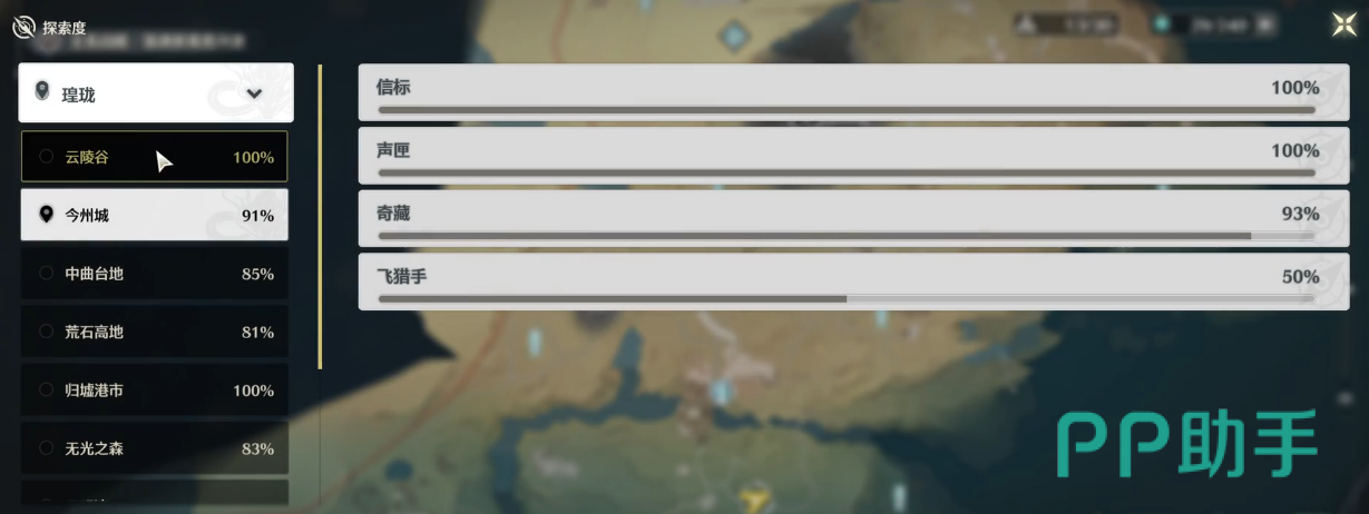 点击红色方框处就可以进入更详细的探索度界面,会展示大地图以及各个小区域的探索情况,以今州城为例,可以看到是否信标全开,声匣都收集了,还有就是奇藏宝箱、飞猎手、观景点相关的。