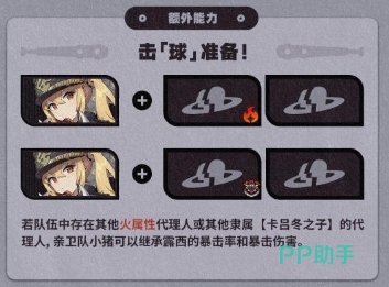 露西的额外能力非常强大,尤其在特定条件下能够显著提升团队的战斗能力。具体而言,如果队伍中有其他火属性的代理人,或者是属于“卡吕冬之子”阵营的代理人,露西的亲卫队小猪就能继承她的暴击率和暴击伤害。这种能力不仅在火系或“卡吕冬之子”阵营中表现出色,而且能够显著增强整个队伍的输出能力。在面对高防御的敌人时尤为有效,因为亲卫队小猪的暴击伤害能够有效地突破敌人的防御,为团队创造更多的输出空间。
