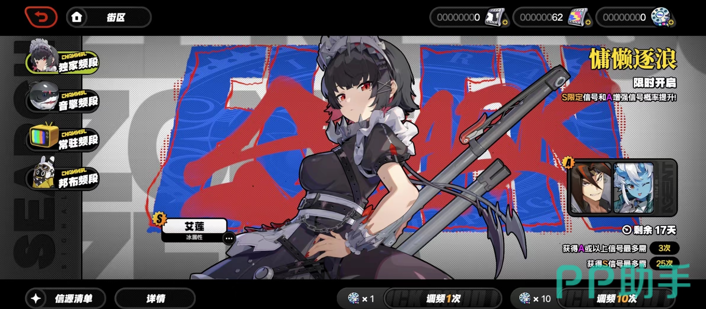 先来给大家讲一下最基础的常驻频段,也就是大家口中的常驻卡池,这个池子对于新玩家来说是最重要的一个,因为这里设置了新人特惠。首先是新人折扣价格,从首次参加抽取开始,前5次10连抽都可以享受到8折优惠,也就是只需要付出8张抽卡道具,就可以进行一次10连抽。同时还存在的新人保底,在常驻池中可以直接获得自己账号首个s级角色,出现的首个s信号必定是代理人,不用担心卡池变歪出现武器的情况。目前在常驻卡池中拥有的s级代理人为丽娜、珂蕾妲、格丽丝、猫又、11号和莱卡恩。
