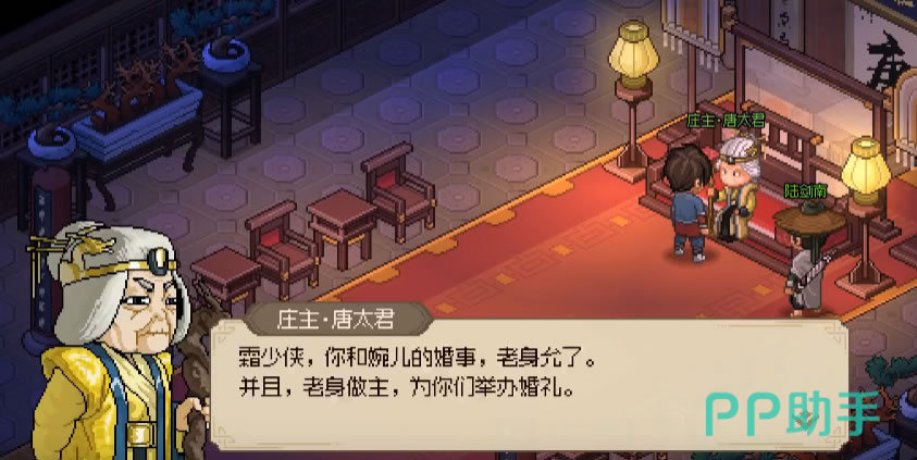 等到主角与唐婉儿与花海定情之时,唐婉儿言及婚姻大事不能自己擅做主张,还要禀过唐太君同意才能结为连理。于是主角又来到万兽山庄,虽说是一番花言巧语连彩礼钱都没给;唐太君却是毫不在意慨然应允,倾尽家财陪着嫁妆为主角和唐婉儿举办了婚礼。