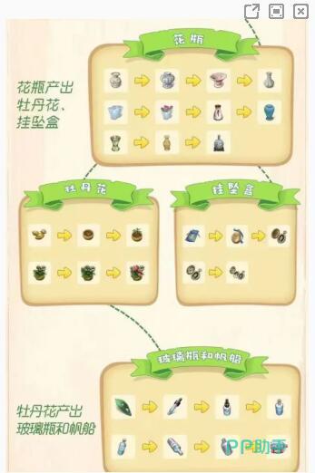 至于说玩家在获得了牡丹花之后,如果后续还会继续再合成,那么进一步还可以获得玻璃瓶,还有就是帆船之类的物品。