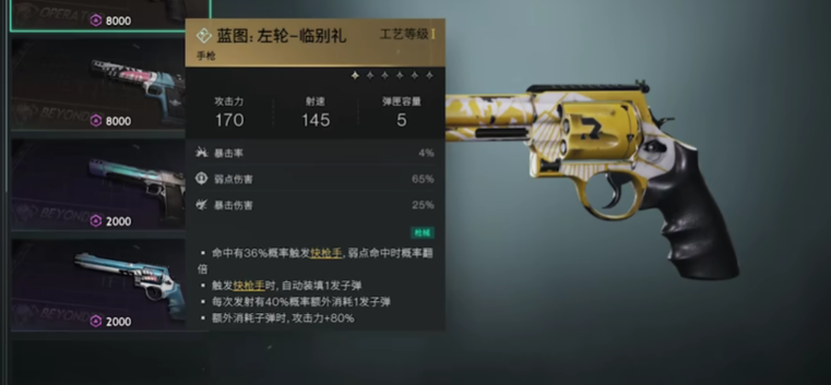 这个属于手枪类别,本身基础攻击力很高,到达了170点,但是射速很慢,弹匣容量也不高,对于玩家的精准度要求还是很高的。暴击率只有4%,弱点伤害有65%,暴击伤害有25%,这两个属性还是不错的。自带的词条属性是可以弥补一定射速缺点的,在命中的时候有36%的几率触发快枪手状态,如果弱点命中了,这个概率还会翻倍。该状态下会自动装填子弹,省去玩家换弹步骤。