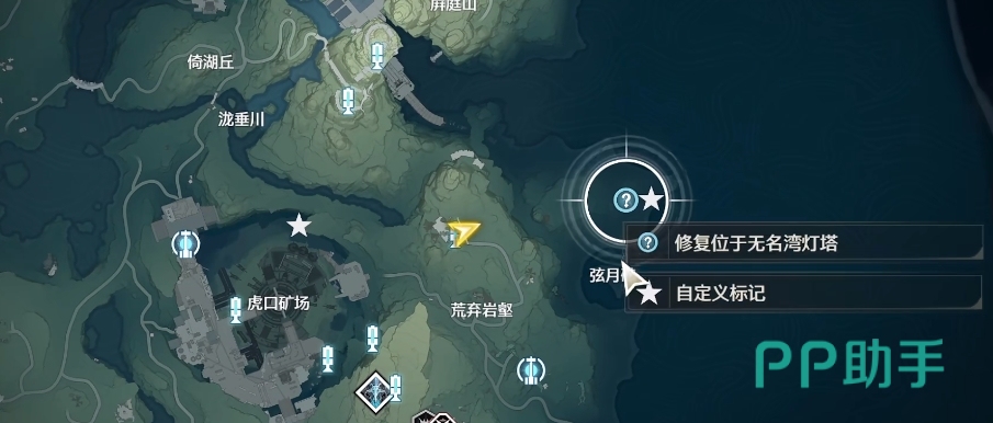 第三个灯塔相对来说比较容易寻找,可以先在地图上找到虎口山脉,然后在山脉的东边地方是无名湾,它的西北方向就是了。