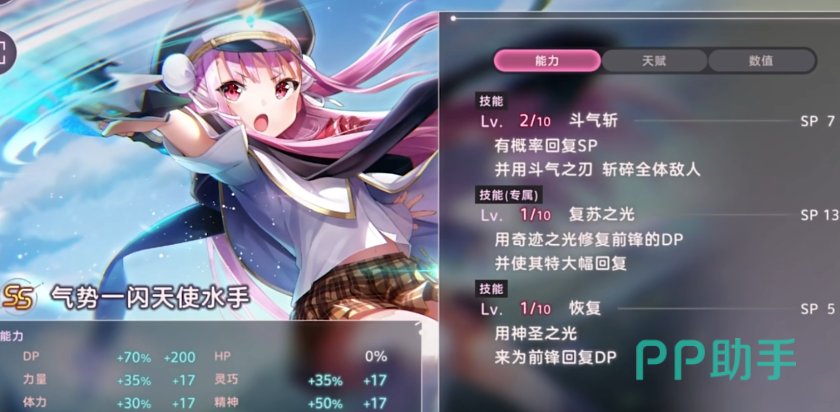 治疗者,不仅有回复DP、复活,自身也有一定的群体输出能力,游戏后期都有上场空间,属于是抽到必练的角色,是很值得自选选择的角色。