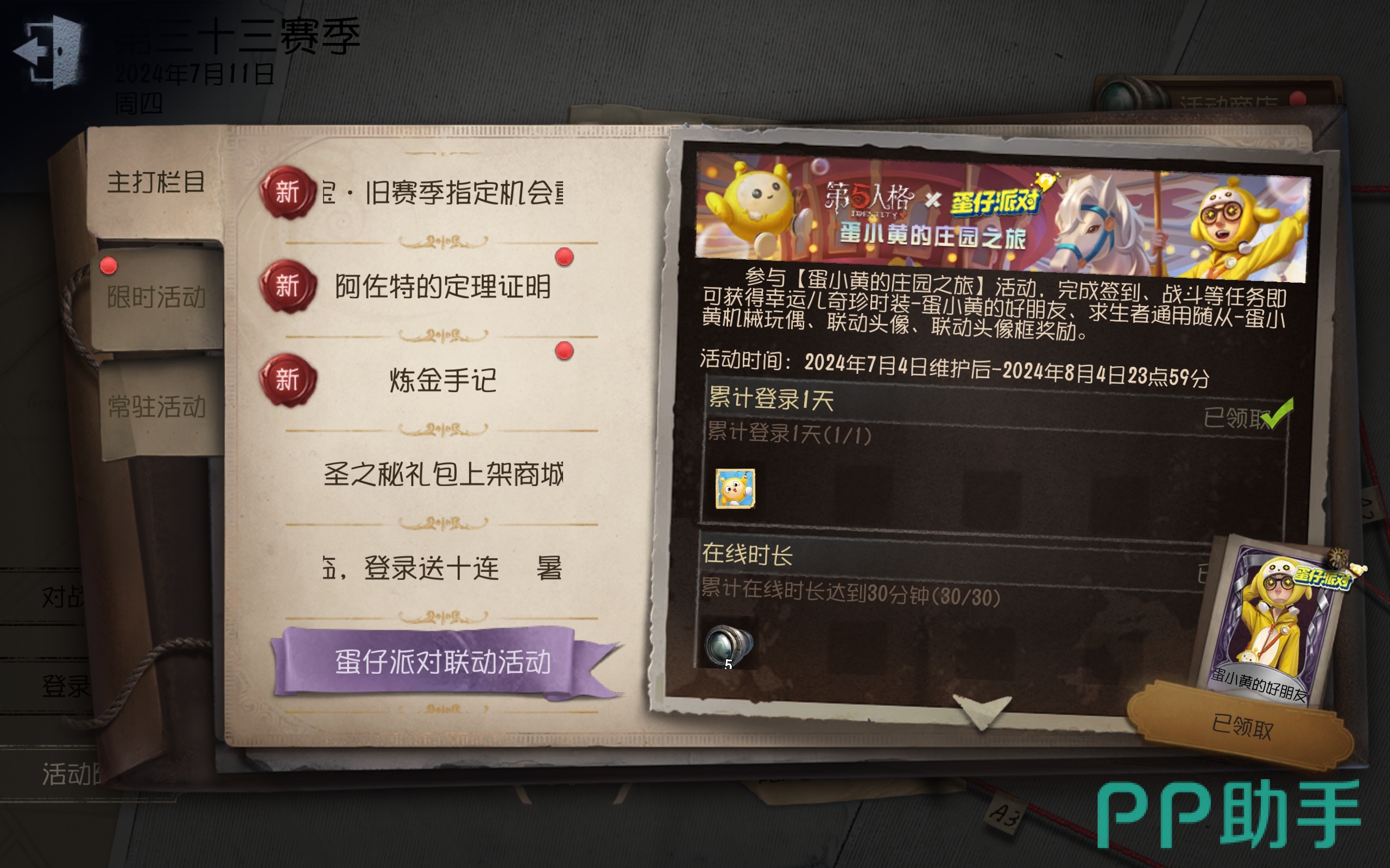 任务奖励方面,累计登录3天游戏,即可领取蛋仔派对联动蛋小黄头像和配套头像框;累计完成20场演绎积分在2500以上的对局,即可获得10封友谊之信,30线索和30 紫薯;赢得5场演绎积分达到2500分以上的平局或者胜利,即可领取“蛋小黄机械玩偶”随从以及一张1天的通用奇珍时装体验卡;累计在线时长达到30分钟,即可获得30窥镜。可以说这次的奖励,第五人格是给的相当的全面了。