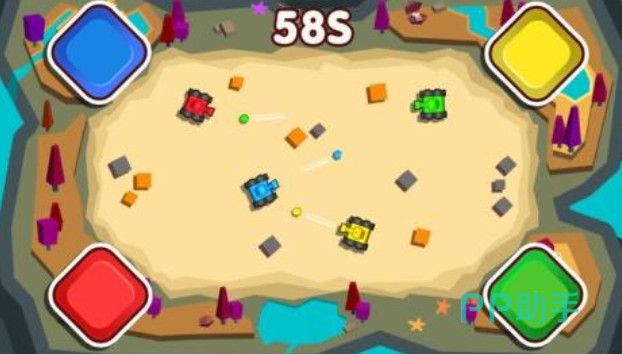 这是款能容纳四个玩家一起玩的上帝视角坦克射击游戏,色彩鲜艳的四个坦克会在一起互相对射,欢乐的游戏气氛与卡通的画面效果相得益彰,这款坦克射击手游容错率超级低,玩家的坦克遭受一次打击就会粉身碎骨,硬核的玩法考验大家的反应速度和微操能力,这款内存很小的同屏对战游戏值得大家尝试。
