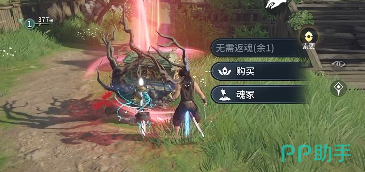 点击返魂秘商就可以在商人处购买各种道具,比方说回复药、钩索等等需要用到的物品,同时这也是玩家的复活点,初次返魂或者是复活队友都需要在这个地方,地图上除了返魂秘商外还有地脉仪。