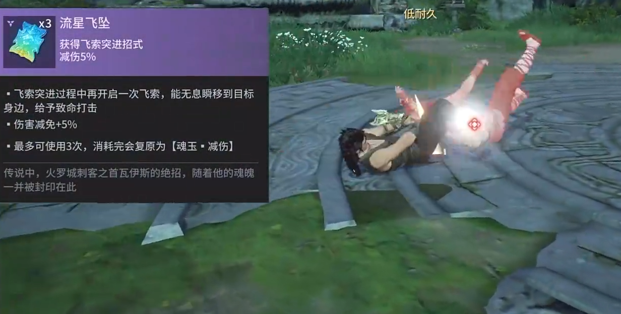 魂玉流星飞坠,在携带后能在使用飞梭突进的时候,再开启一次飞梭,并无声无息的瞬移到敌人的身边,给予一次致命打击,大家可以在追击敌人的使用,同时这个魂玉能提升12%的体力。