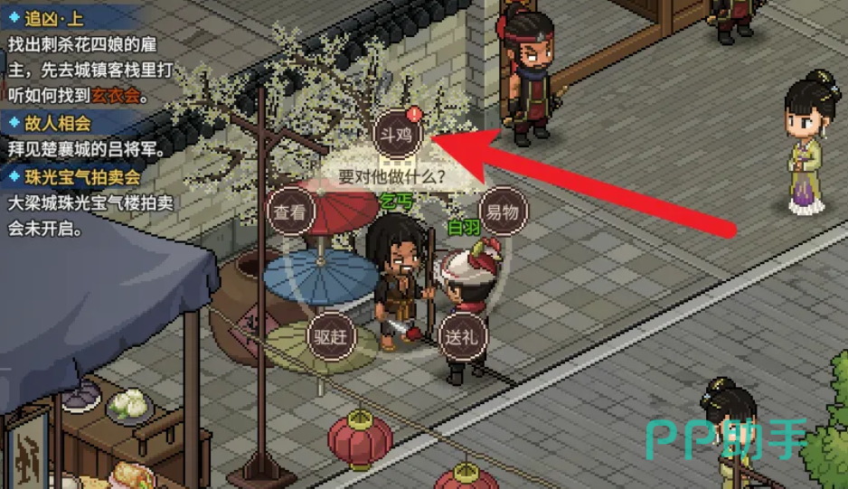 想要参与该玩法,玩家首先需要有一只自己的机,我们在白天的时候去楚襄城一趟,找到丁家的大门口,会发现门口蹲着一个乞丐,和他对话就能得到一个小鸡崽,再次找他对话,头上就会弹出一个斗鸡的选项我们选择斗鸡即可开始。