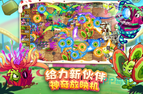 这款以植物大战僵尸为主题的横版策略游戏,拥有丰富多样的色彩及华丽的色调,玩家可以合理搭配植物阵容以及相关道具,然后与僵尸作战。与原著中的植物大战僵尸比较相似,只不过画风再次升级。游戏当中的炮塔植物以及场景都做了全面升级,升级玩家可以在花园等多个不同的地方与僵尸作战。