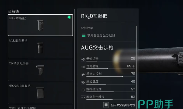 首先我们先选择AUG精英一体消音管,它本身的优势射程已经有65米,其实已经足够了,因此精校方面我们将枪口初速拉高,这样就会使数值达到740米每秒,子弹能飞得更快。由于这把枪没有一个更好的增加垂直坐力的搭配,所以握把这里目前选择RK-0前握把。因为它的属性是可以额外增加垂直后坐力的,戴上这个配件后我们不需要进行一定的精校,因为它只有一个可调整数值,如果对数值进行改动,则会使榆林匠瞄准时移动速度减少。