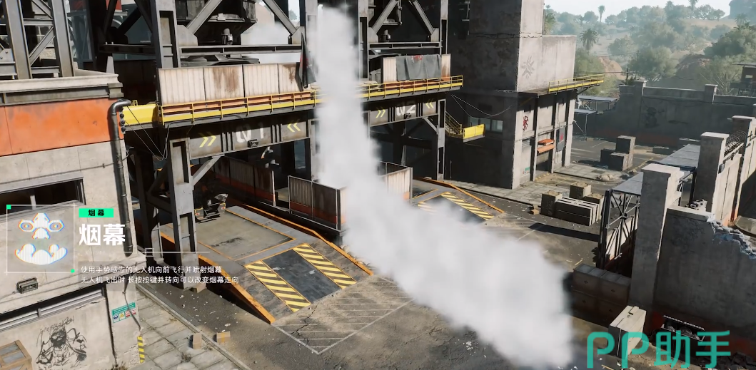 V技能烟幕是一个防御技能,使用后可以在释放位置形成一道烟幕,烟幕可以通过开火按钮实现转弯。这是一个非常强大的烟雾技能,它不像烟雾弹那样只有一小团区域,而是会形成一个长条的烟幕,可以分割战场,掩护大量队友撤退。