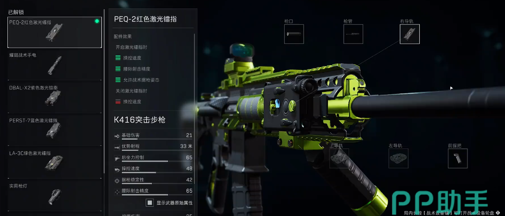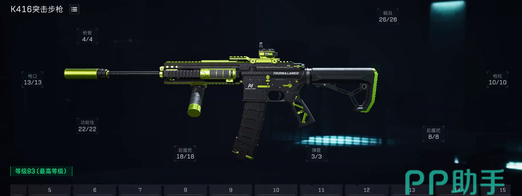 这里推荐大家使用K416突击步枪,这是一把主攻近战兼顾中远距离的好枪。近战可以轻松吊打冲锋枪,因为操控速度可以堆到80+的同时,还能有37米优势射程,70后坐力,880射速。唯一的缺点就是升级太慢,83级所需要花费的时间还是挺长的,建议有充足经验卡的玩家入手,否则SCAR-H更适合大家。